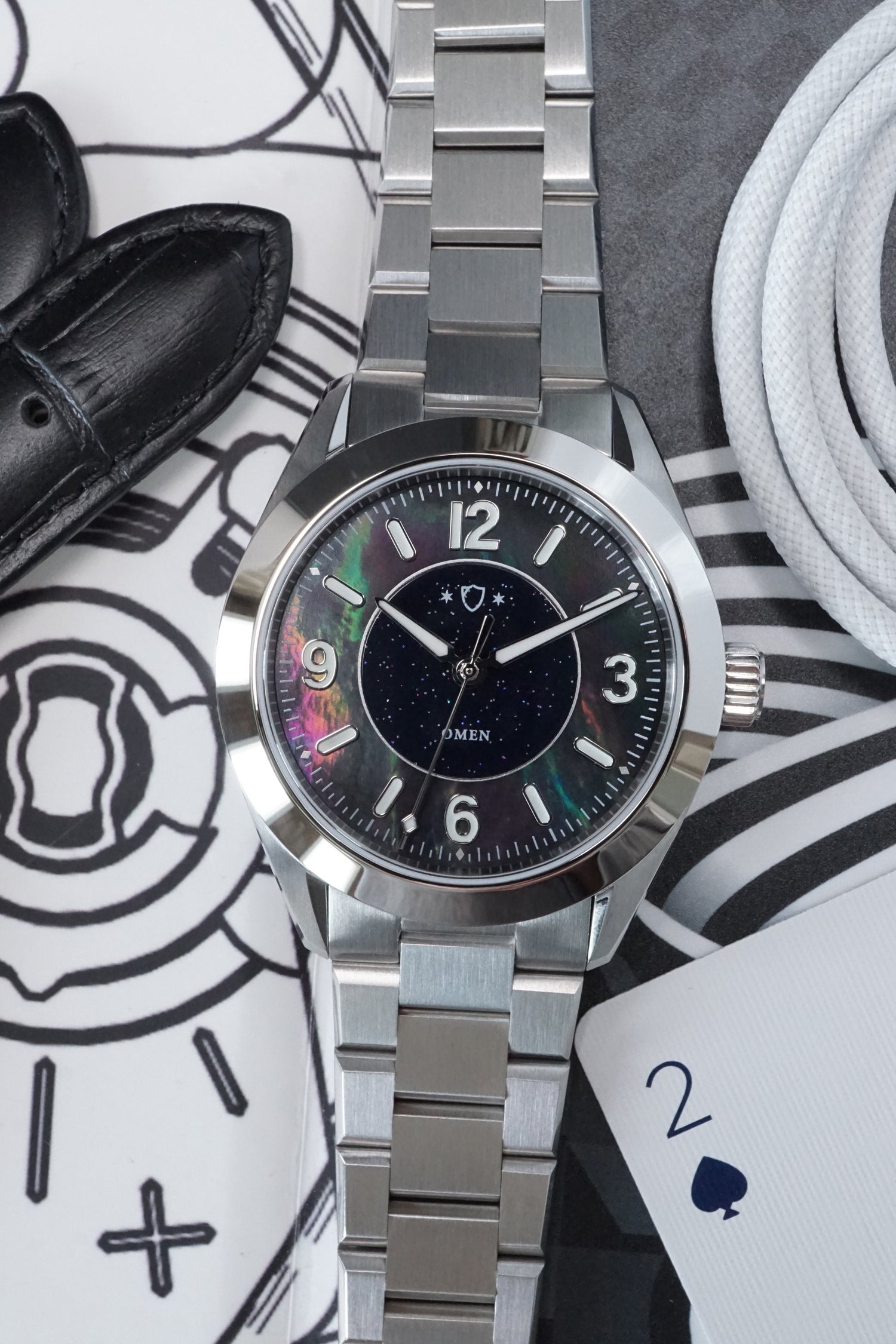 The inner dial is laid in aventurine — its natural glittering inclusions evokes a field of stars scattered across the night sky. Surrounding it, a ring of black mother-of-pearl represents the vast galaxy that holds those stars. Together, they create a dial that shifts and shimmers with every movement of the wrist, never looking quite the same twice.