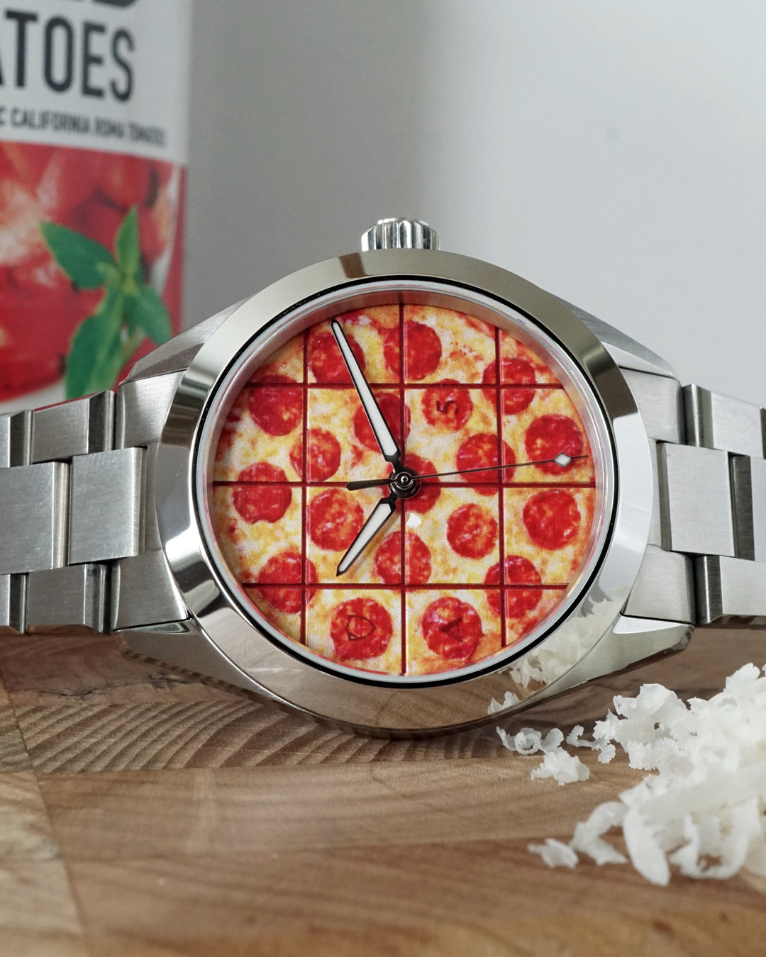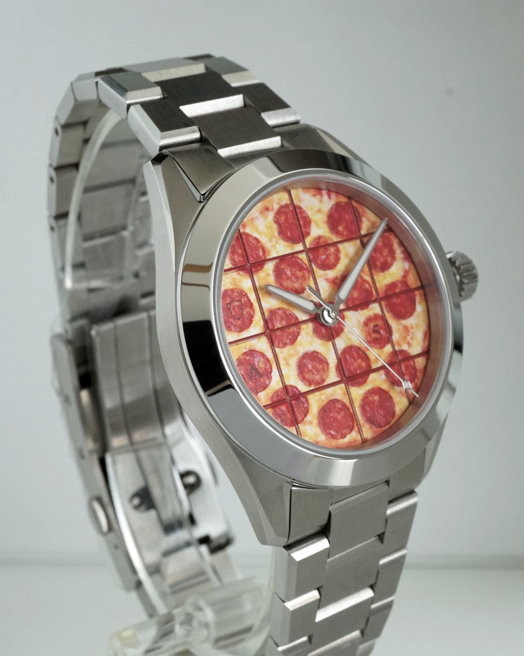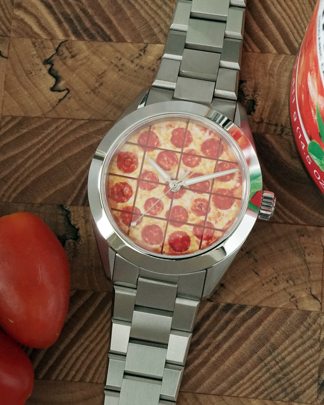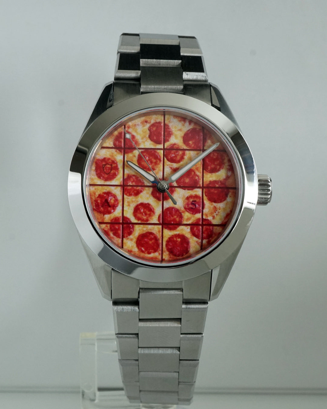 In collaboration with Red5WatchWorks and AndoAndoAndo, the A3 Tavern Style uses an embossed dial that captures the look of a Chicago Tavern Style Pizza to near perfection. The dial is "sliced" into squares with grooves in the dial and features pepperonis that are raised above the cheese! If you look close enough, there are 3 pepperonis with logos of collaborators on them!