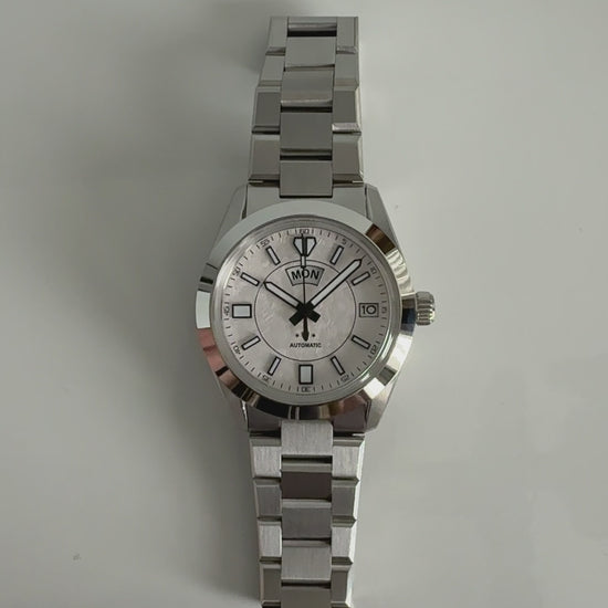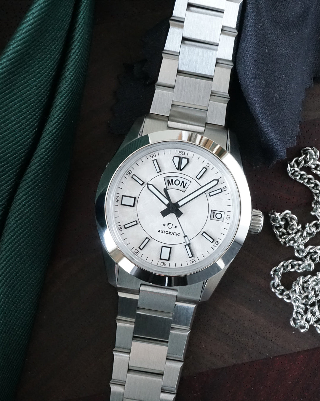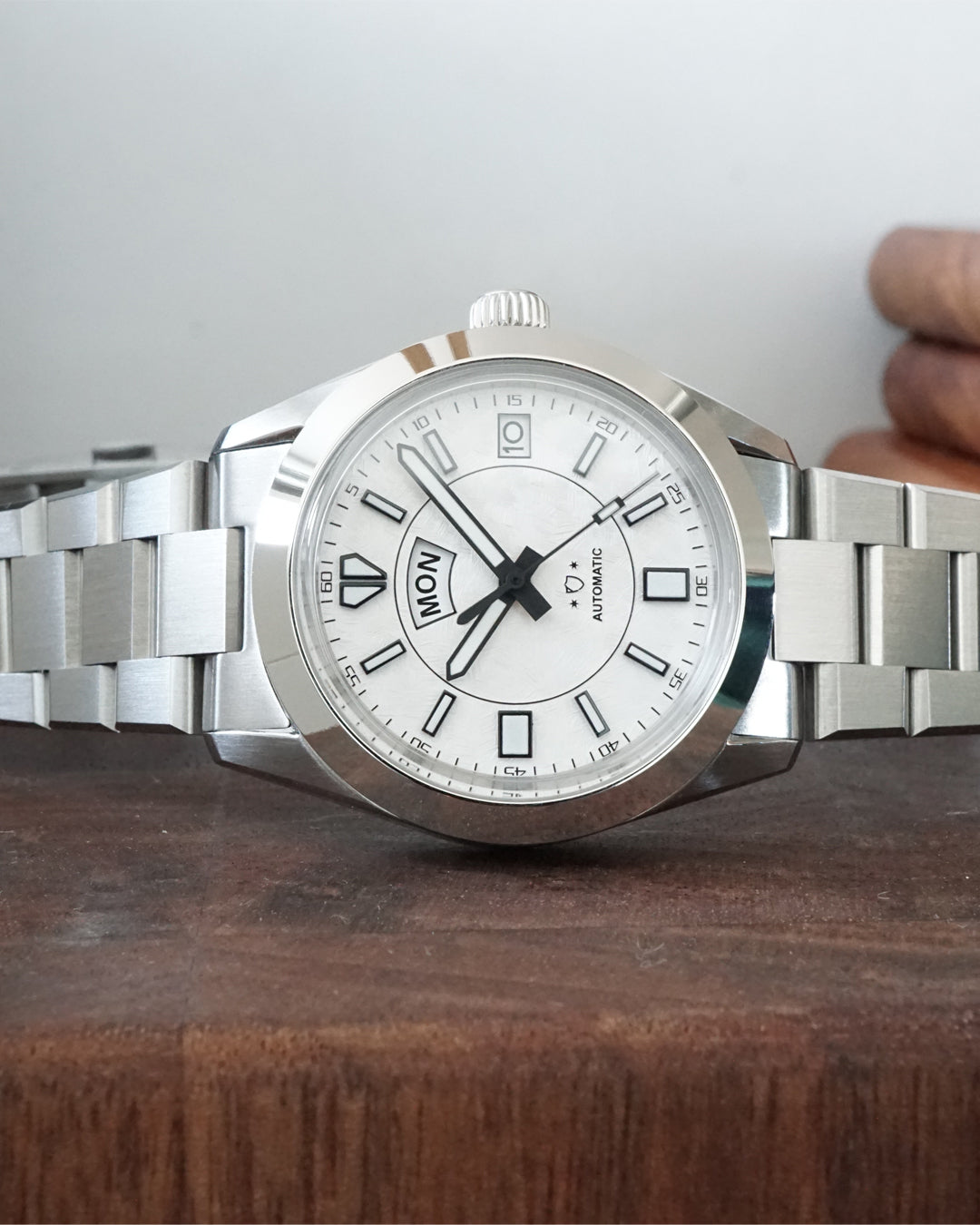 The A5 Legacy X marks ten years of Alexander James Watches. Inspired by the dials I first designed a decade ago, it has evolved through years of refining my craft. The Legacy X builds on the past, featuring a sector layout, a bold day window, and premium finishing with intricate cuts across both the case and bracelet.